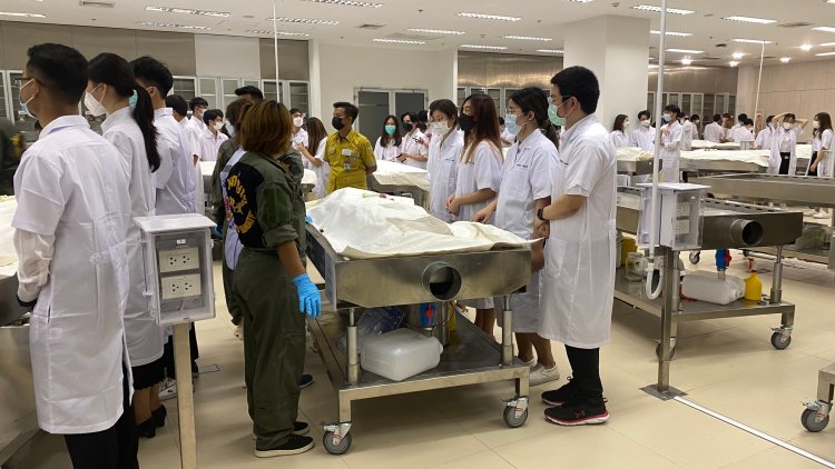 วันนี้ 17 พ.ค. 65 ณ ห้องปฏิบัติการกายวิภาคศาสตร์ ชั้น 3 อาคารศูนย์การเรียนรู้ฯ 2 (พรีคลินิก) ภาควิชากายวิภาคศาสตร์ คณะวิทยาศาสตร์ มหาวิทยาลัยมหิดล โรงพยาบาลรามาธิบดี สมุทรปราการ ตำบลบางปลา อำเภอบางพลี จังหวัดสมุทรปราการ เหล่านักศึกษาแพทย์ชั้นปีที่ 2 หลักสูตรแพทยศาสตรบัณฑิต คณะแพทยศาสตร์โรงพยาบาลรามาธิบดี มหาวิทยาลัยมหิดล และ วิทยาลัยวิทยาศาสตร์การแพทย์เจ้าฟ้าจุฬาภรณ์ ราชวิทยาลัยจุฬาภรณ์ ได้จัดพิธีขอขมาและอำลาร่างอาจารย์ใหญ่โดยพิธีนี้จะจัดขึ้นเพื่อเป็นการแสดงความกตัญญูกตเวทิตาคุณแด่อาจารย์ใหญ่ ผู้อุทิศร่างกายเพื่อการศึกษา เมื่อสิ้นสุดการเรียนการสอนในรายวิชาที่เกี่ยวข้องกับมหกายวิภาคศาสตร์ ของนักศึกษาแพทย์ ชั้นปีที่ 2 จำนวน 40 ร่าง โดยมีบางส่วนที่ทางญาติติดต่อขอรับร่างไปประกอบพิธีทางศาสนาแล้วก่อนหน้านี้