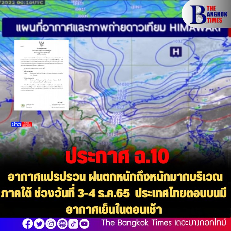 03 ธ.ค. 2565 กรมอุตุนิยมวิทยา ประกาศฉบับที่ 10 อากาศแปรปรวนบริเวณประเทศไทยตอนบน และฝนตกหนักถึงหนักมากบริเวณภาคใต้