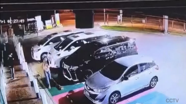ภาพจากกล้องวงจรปิดจับภาพวันที่ 25 ก.พ. เวลา 02.01น. พบว่าเห็นรถทั้ง3คัน ซึ่งเป็นรถเอาผาดสีดำ 1 คัน เป็นของนายปอที่นั่งโดยสารมากับนายจ๊อบ ถัดมาพบเอาผาดสีขาว 2 คัน หนึ่งคันเป็นของนายโรเบิร์ต และอีกหนึ่งคันเป็นของแซน โดยทั้งหมดได้มาจอดเรียงกันที่บริเวณลานจอดของปั๊ม แต่สังเกตว่าในจังหวะนั้นได้มีรถเก๋งยี่ห้อโตโยต้ายาริสสีบอน มาจอดเป็นคันที่ 4 ซึ่งมีผู้ชายใส่เสื้อสีเทาเดินลงมาจากรถ เบื้องต้นยังไม่ได้รับคำยืนยันว่าเป็นหนึ่งในกลุ่มที่อยู่บนเรือหรือไม่ หรืออาจเป็นคนนอกที่เข้ามาร่วมพูดคุย ซึ่งหลังจากที่รถยาลิส สี่บอนได้มาจอด ก็ได้เดินไปยืนคุยกัน ที่บริเวณหน้ารถเอาผาด หลังจากนั้นมีการพูดคุยกันเสร็จแล้วสังเกตว่าท่าทีของแต่ละคน เดินถือโทรศัพท์พูดคุยแยกกันไปคนละทิศทาง เป็นเวลาที่อยู่ในปั๊มประมาณ 30นาที ก่อนที่ทุกคนจะขึ้นรถและขับเลี้ยวออกจากปั๊มน้ำมัน