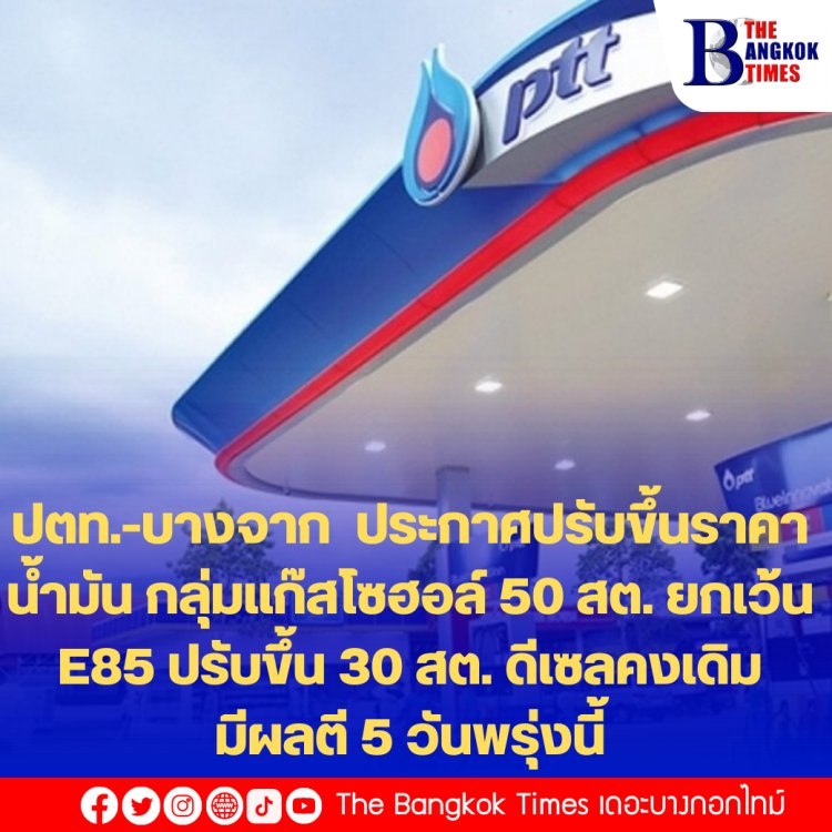 ปตท.-บางจาก ประกาศปรับขึ้นราคาน้ำมัน กลุ่มแก๊สโซฮอล์ 50 สต. ยกเว้น E85 ปรับขึ้น 30 สต. ส่วนกลุ่มดีเซลคงเดิม มีผลตี 5 วันพรุ่งนี้