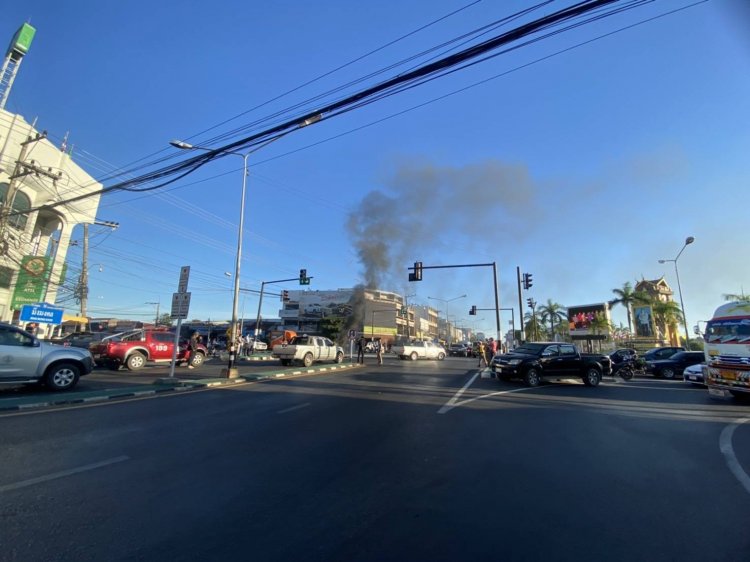 อำนาจเจริญ- เกิดเหตุการณ์ระทึกจุดไฟเผายางรถยนต์กว่า3เส้นกลางสี่แยกวงเวียนใหญ่ใจกลางเมืองอำนาจเจริญเบื้องต้นตำรวจสัญนิฐานว่าคาดว่าผู้ก่อเหตุเครียดมีปัญหาเรื่องการครองชีพ