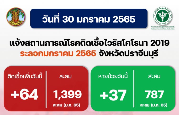เมื่อเวลา 20.15 น.วันนี้ 30 ม.ค.65 ผู้สื่อข่าวประจำ จ.ปราจีนบุรีรายงานว่า ฝ่ายประชาสัมพันธ์ได้แจ้งสถานการณ์โรคติดเชื้อไวรัสโคโรนา 2019 ระลอกมกราคม 2565 จังหวัดปราจีนบุรี ณ วันที่ 30 มกราคม 2565