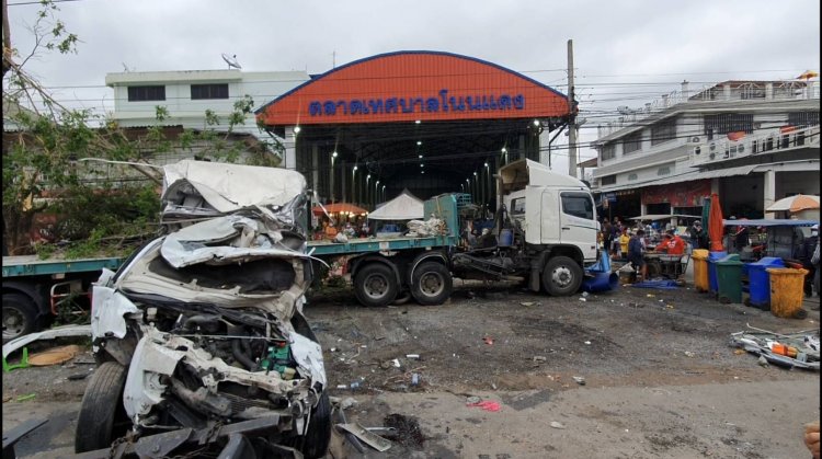 นครราชสีมา-แม่ค้าวิ่งหนีตายวุ่น!รถบรรทุกพ่วง คาดหลับใน เสียหลักพุ่งกวาดตลาดเช้าโนนแดง โคราช บาดเจ็บ 3 ราย