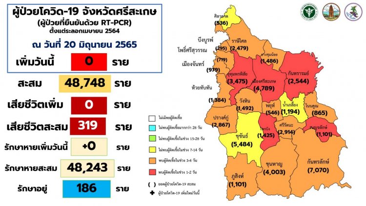 สถานการณ์ผู้ป่วยโควิด 19 จังหวัดศรีสะเกษวันนี้ที่ 20 มิถุนายน 2565 ผู้ป่วยเพิ่มวันนี้ไม่มีเสียชีวิตไม่มี ผู้ป่วยสะสม 48,748 รายเสียชีวิตสะสม 319 รายรักษาหายสะสม 4,8243 รายที่ยังรักษาอยู่ 186 รายแต่อำเภอกันทรลักษ์เมืองทุเรียนหมอนทอง ผู้ป่วยพุ่งสูง7,070 ราย ทั้งในสวนและนอกสวนทุเรียน หน้ากากอนามัยจึงมีความจำเป็นยามเข้าสวน