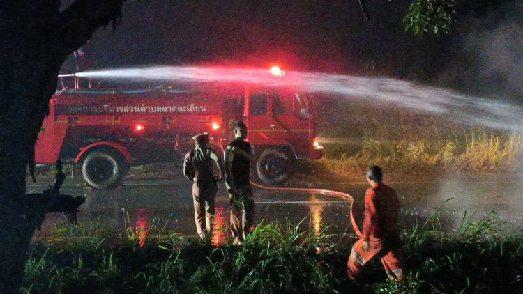 ระทึก!ไฟไหม้รถบรรทุกน้ำมัน 4.8 หมื่นลิตร กระพุ่งชนกลางลำเจ็บ 2