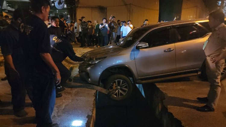 หนุ่มขับฟอร์จูนเนอร์เกือบตกบ่อพักน้ำเหตุถนนจตุรทิศทรุดตัว