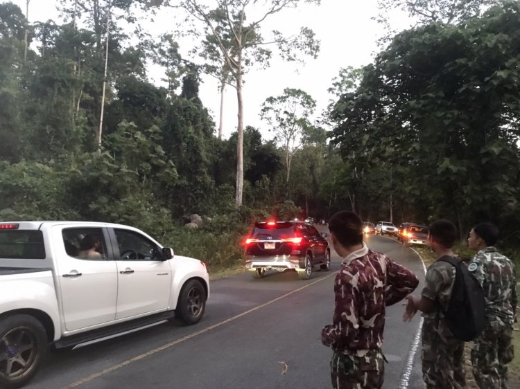 ขณะที่ชุดเคลื่อนที่เร็วเฝ้าระวังช้างป่าในการดูแลนักท่องเที่ยว ที่มีประจำตามเส้นทางได้มาอำนวยการ ท่ามกลางนักท่องเที่ยวที่รถติดยาวเกือบ 1 กม. พบหลายคนไม่กลัวโขลงช้างพากันมาถ่ายภาพ โดยช้างมีสภาพอารมณ์ดีหูโบกพัดหางกวัดแกว่งไป-มา มีแม่แปลกคอยคุมลูก ๆ ช้างไม่ให้ซุกซน โดยบางครั้งลงถนน บางครั้งพากันขึ้นมา หรือเดินเรียงแถวไปตามแนวถนน