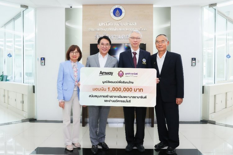 มูลนิธิแอมเวย์เพื่อสังคมไทย นำโดยนายกิจธวัช ฤทธีราวี ประธานกรรมการมูลนิธิแอมเวย์เพื่อสังคมไทย (ที่ 2 จากซ้าย) พร้อมด้วยตัวแทนคณะกรรมการมูลนิธิฯ มอบเงินสนับสนุนจำนวน 1 ล้านบาท เพื่อเป็นทุนในการสร้างอาคารโรงพยาบาลรามาธิบดี และย่านนวัตกรรมโยธี เพื่อเพิ่มศักยภาพและยกระดับของการให้บริการทางการแพทย์ โดยมี ศ.คลินิก นพ.อาทิตย์ อังกานนท์ รองคณบดีคณะแพทยศาสตร์ โรงพยาบาลรามาธิบดี และรองประธานคณะกรรมการบริหารมูลนิธิรามาธิบดี (ที่ 2 จากขวา) เป็นผู้แทนรับมอบ ณ โรงพยาบาลรามาธิบดี เมื่อเร็วๆ นี้