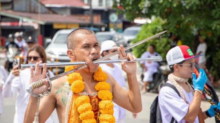 นักท่องเที่ยวร่วมรับองค์พระในพิธีแห่พระรอบเมืองงานประเพณีถือศีลกินผักจังหวัดภูเก็ต