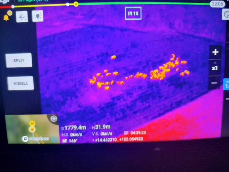 เมื่อคืนที่ผ่านมา เจ้าหน้าที่กู้ภัยมูลนิธิฮุก 31 นครราชสีมา นำโดรนตรวจจับความความร้อน ขึ้นสังเกตการณ์เพื่อวางแผนให้ทีมอาสาสมัครเฝ้าระวังช้างป่า ระหว่าง ต.อุดมทรัพย์ อ.วังน้ำเขียว และ ต.จระเข้หิน อ.ครบุรี จ.นครราชสีมา เข้าทำการผลักดันช้างป่าที่ออกจากเขตอุทยานแห่งชาติทับลาน มาหากินภายในพื้นที่การเกษตรของชาวบ้าน บริเวณไร่มันสำปะหลังท้ายบ้านตลิ่งชัน ต.จระเข้หิน อ.ครบุรี ตั้งแต่ช่วงคืนวันที่ 13 พฤศจิกายน 2567 ที่ผ่านมา โดรนสามารถจับภาพโขลงช้างขนาดใหญ่เกือบ 80 ตัว รวมโขลงกันออกหากินมันสำปะหลังของชาวบ้าน จึงต้องใช้กำลังเจ้าหน้าที่และอาสาสมัครกว่า 10 นาย ผลักดันตลอดทั้งคืนกว่าช้างจะอยู่กลับเข้าป่าไปในที่สุด