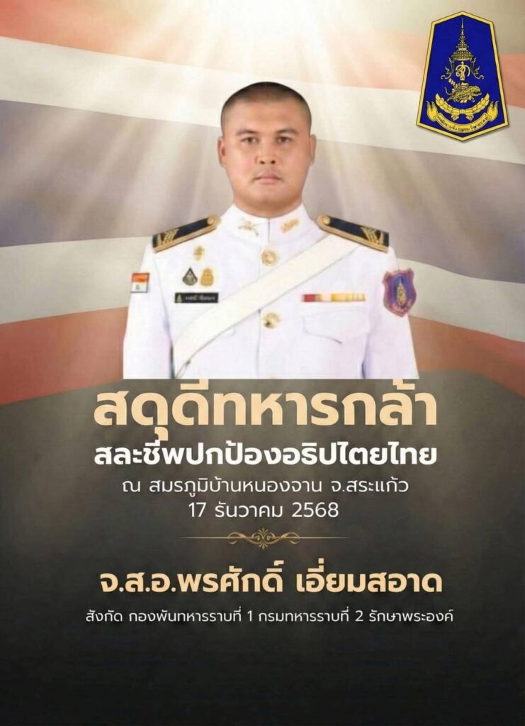 เมื่อวันที่ 18 ธ.ค. 68 ผู้สื่อข่าวรายงานว่า นางสำอางค์ เอี่ยมสอาด มารดา น.ส.ฝน สุริวงศ์ ภรรยา นางเตือนใจ ลามนต์ แม่ยาย และ ด.ช.ภูเขา เอี่ยมสอาด ลูกชาย อายุ 6 ขวบ เดินทางไปรับศพ จ.ส.อ.พรศักดิ์ เอี่ยมสอาด อายุ 37 ปี ทหารสังกัดกองพันทหารราบที่ 1 กรมทหารราบที่ 2 ค่ายจักรพงษ์ จ.ปราจีนบุรี จาก รพ.เจ้าพระยาอภัยภูเบศร จ.ปราจีนบุรี มาถึงบ้านเลขที่ 58 หมู่ 7 ต.เขาพระ อ.เมือง จ.นครนายก ซึ่งเป็นบ้านเกิด โดยรถ FTTS มทบ.12 ค่ายจักรพงษ์ จ.ปราจีนบุรี และมีรถนำของ สภ.เมืองนครนายก